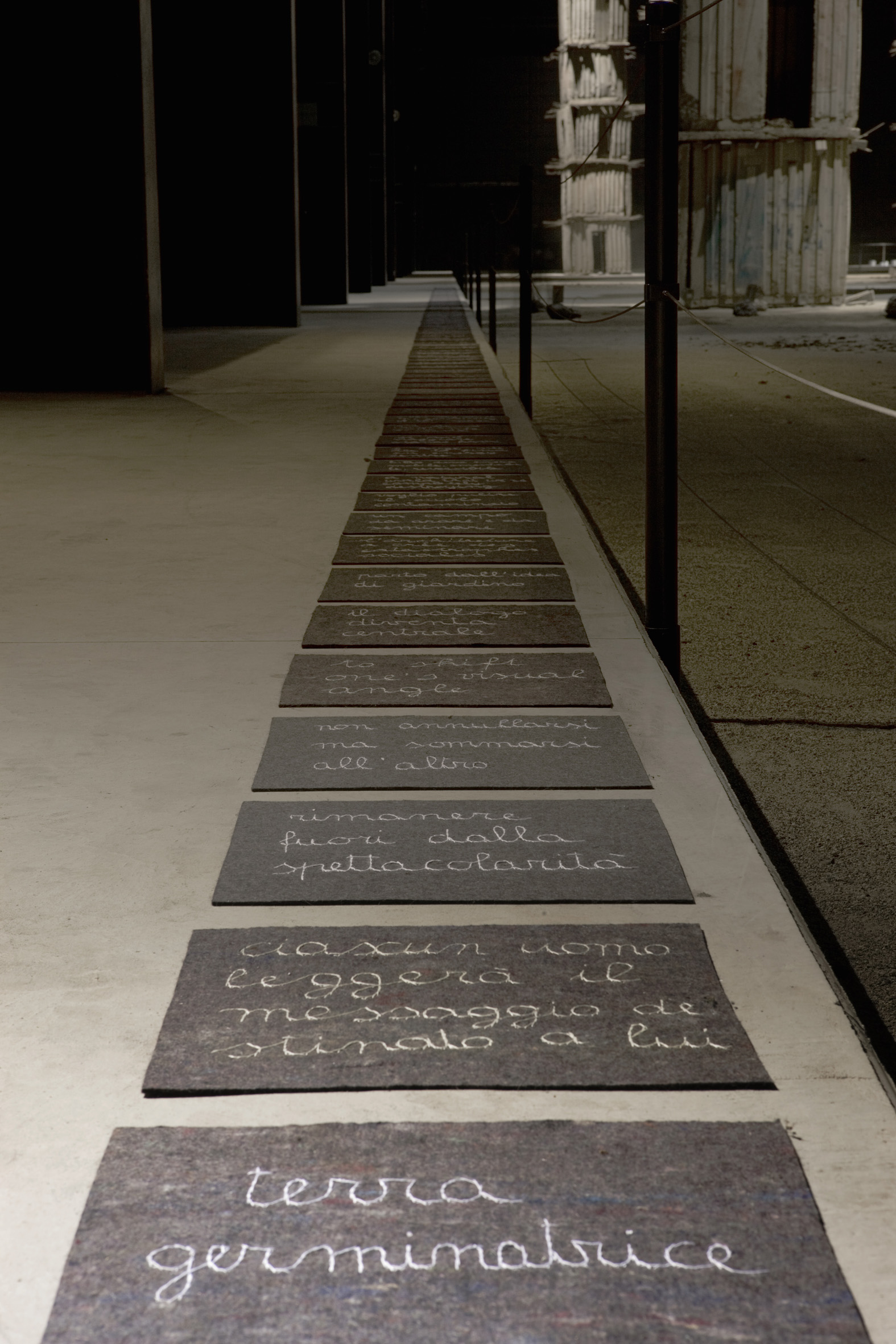 Ed ecco allora aggiungersi alle opere già presenti per la prima mostra, per esempio, la grotta del trio di Invernomuto, una copia della grotta di Lourdes ma fatta di cera, destinata a dissolversi nel tempo della mostra sotto le lampade alogene. Si incontra poi il poetico lavoro di Adele Prosdocimi, tappeti di feltro con ricamate le riflessioni scaturite dai vari incontri tra gli artisti e i curatori; un video, ma non un documentario, sulle emissioni di radiazioni solari di Margherita Morgantin, per studiare e curare lo stato di salute del nostro pianeta; per arrivare poi all’omaggio ai morti di Bruna Esposito, un angolo votivo con tanto di ceri accesi e malinconica musica in sottofondo, opera piccola e solitaria, “dedicata alla paura di morire”.