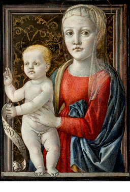 E’ la piccola ma preziosa tavola della Madonna con il Bambino, datata 1445 circa, attribuita al Maestro di Pratovecchio. Una tavola presumibilmente creata per la devozione privata, visto il piccolo formato, e che mostra una giovane Madonna dallo sguardo rassegnato, intenta a scrutare l’avvenire, che sa essere già carico di dolore. La madre e il Bambino, nell’atto di benedire, sono racchiusi in una sorta di nicchia coperta da quello che sembra essere un motivo damascato. La tavola è un dipinto poco noto, non solo per il pubblico ma anche per gli esperti, e che fu studiato e fotografato già da Roberto Longhi, che dedicò anche un saggio per ricostruire le vicende del misterioso pittore.