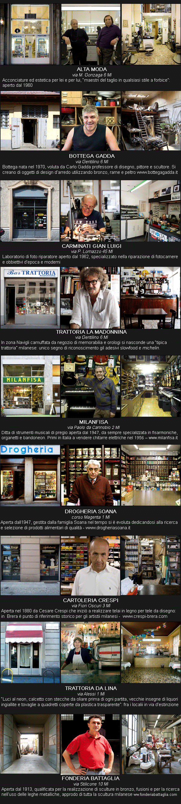 In sordina le botteghe storiche popolano ancora le vie di Milano: sono più di duecentocinquanta le “imprese commerciali e artigiane”, riconosciute, operanti in città che da oltre 50 anni svolgono la stessa attività. Il Comune di Milano dal 2004 ha istituito un albo per tutelarle e proteggerle quale “bene culturale e a rischio di estinzione”: radicate nel tessuto urbano, sono depositarie di un patrimonio di tradizione e storia che conservano ancora intatto, il più delle volte animate da famiglie in cui passione per il lavoro e                                    professionalità  si tramandano di generazione in generazione.