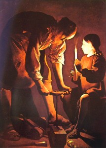 Scene intime e familiari, che tuttavia colpiscono non solo per la straordinaria resa della fiamma, quanto per la luce e le ombre che essa proietta sui volti che la circondano: sono proprio questi contrasti a donare alle due opere la loro forza emotiva e simbolica. Uno stile che rimanda immediatamente ai pittori fiamminghi e alle loro scene di interni, tradizione sicuramente nota a de La Tour, e che lo ha fatto paragonare anche, e in passato confondere, con il più enigmatico dei pittori olandesi, Jan Vermeer. La luce di de La Tour è mistero. Illumina, è simbolica, a volte è nascosta: nel San Giuseppe falegname la fiamma è celata dalla mano ormai trasparente del Bambino, ne illumina a pieno il volto idealizzato, che ha ben poco di umano, e lo rende fulcro di un momento intimo e psicologico di grande intensità, in una scena che va oltre l’attimo contingente.