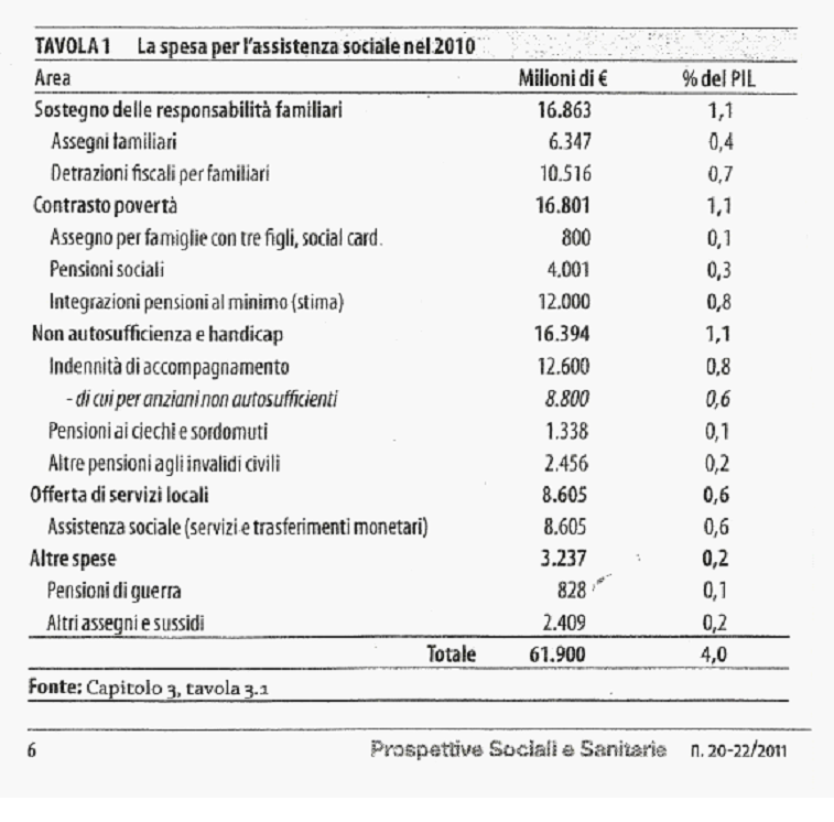 Questo nuovo metodo che non comporta ulteriori costi, si rivelerà particolarmente utile nell’attuale momento di crisi, dove in prospettiva non si potrà contare su risorse aggiuntive a fronte di un inevitabile incremento della povertà, del trend della bassa natalità, di un invecchiamento pressoché esponenziale con relativi malati cronici e non autosufficienti. Necessita pertanto una riforma che a costo zero utilizzi senza sprechi i 50 miliardi di euro indicati per questi settori di intervento nell’allegata tabella dei costi sociali globali del 2010.