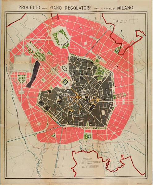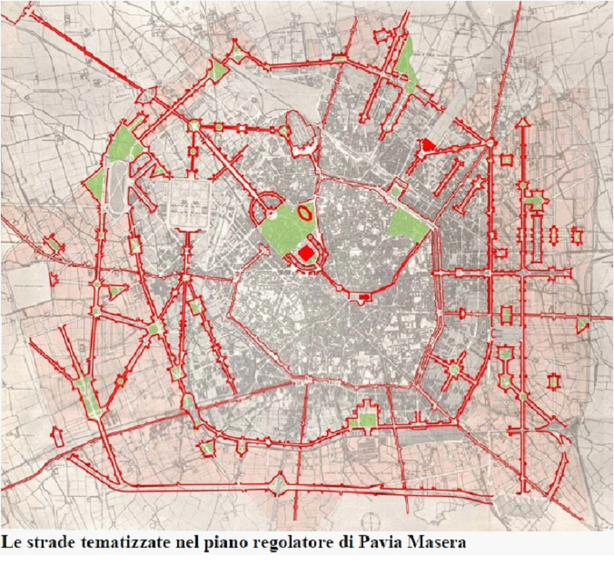 Ma nel frattempo la gamma delle strade e delle piazze tematizzate era andata arricchendosi dei boulevard – strade più larghe, di solito fino a cinquanta metri – disposti l’uno di seguito all’altro con nello snodo uno square costituito da un vero e proprio giardino pubblico, come piazza Piola o piazza Frattini, e delle passeggiate, queste larghe fino a novanta metri, come viale Argonne e corso Sempione: queste cospicue strade tematizzate saranno caratteristiche dell’ultimo frutto del piano di Cesare Beruto, il piano Pavia-Masera, che copre l’intero territorio comunale nel 1912, forse non a caso adottato da un sindaco socialista il medesimo anno nel quale anche in Italia verrà esteso il voto a tutti i cittadini maschi.