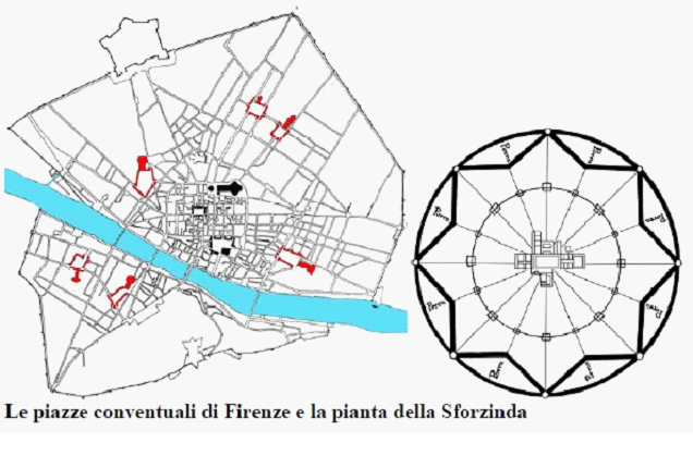 A questo inconveniente porrà un qualche rimedio la presenza delle piazze conventuali: poiché un breve papale imponeva una distanza di almeno cinquecento metri tra un convento e l’altro e tra i conventi e la chiesa principale, di fatto i quartieri nuovi erano tematizzati dalle piazze di un convento, con i suoi frati predicatori ma anche con il mercato, le beccherie e le botteghe che rendono allegra la vita – come sosteneva il frate catalano Francisco Eiximenis, che descrive nel1389 una città ideale e come la disegna Filarete a Milano immaginandola solcata da otto strade maggiori che racchiudono otto quartieri triangolari con al centro la loro piazza quadrata.