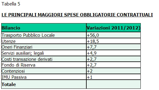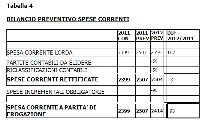 Analoghe ragioni di registrazione contabile generano sostanziali partite di giro che si elidono tra entrate e uscite (per esempio: il Fondo Cosap v/s entrate Cosap) che “gonfiano” il valore assoluto delle voci globali di spesa ed entrata di circa 10 milioni di euro per questa ragione, l’apparente incremento di spesa corrente rispetto al preventivo 2011 corrisponde in termini effettivi una riduzione di circa 100 milioni di euro del costo dei servizi equivalenti, sostanzialmente in linea con il consuntivo 2011, che viene “stabilizzato” e consolidato, dopo essere stato frutto di un taglio emergenziale nel secondo semestre 2011.