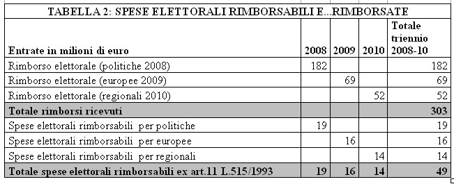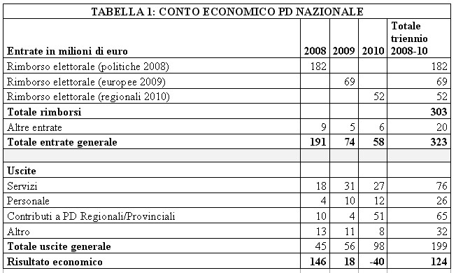 Considerando i bilanci disponibili del PD nazionale, cioĆØ quelli del triennio 2008-10, i costi fissi sono stimabili intorno ai 20 milioni annuali, le spese elettorali dirette, documentate e dichiarate, intorno ai 16 milioni annuali, oltre ai 22 milioni devoluti alle strutture territoriali; d’altra parte i rimborsi elettorali per le Politiche 2008, le Europee 2009 e le Regionali 2010 sono stati pari a 303 milioni e costituiscono il 94% delle entrate del Partito. In altri termini, per le elezioni sono stati spesi effettivamente 49 milioni, mentre ne sono avanzati 254, di cui 60 sono andati per le spese fisse, 66 alle strutture territoriali e 125 sono diventati patrimonio disponibile.