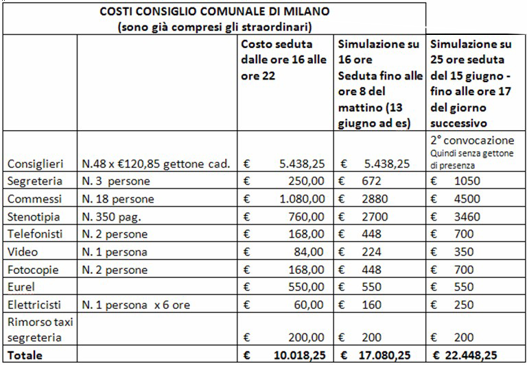 * Aggiungiamo il costo delle cene che Milano Ristorazione trasporta per i consiglieri e il personale del Comune impegnato a lavorare: circa 1.250€ a cena, anche se da questa cifra va tolto il contributo che ogni consigliere paga (corrispondente al costo al vivo del pasto, cioè 4,40€) e il contributo che pagano tutti i dipendenti (pari a 1,06€). Il gettone per i consiglieri varia in base al numero dei Consiglieri presenti ed è da conteggiare solo per le sedute in prima convocazione: la seconda è considerata proseguimento della prima, quindi non porta gettone, (una seduta da quattro ore e una seduta fiume con prima e seconda convocazione come alcune di giugno portano al consigliere lo stesso gettone, tanto per essere chiari).