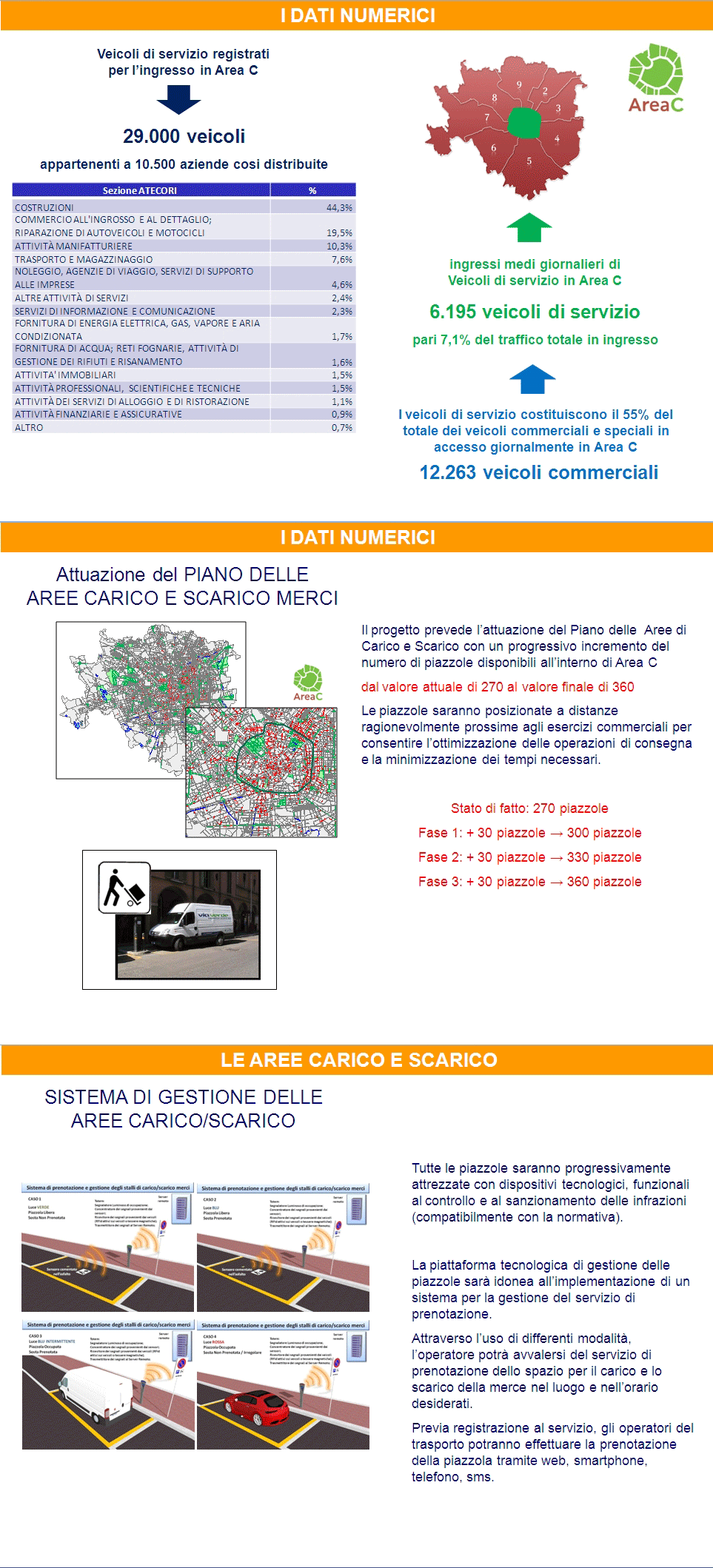 Il programma avviato a Milano. L’attivazione dell’Area C con l’introduzione della congestion charge ha prodotto un primo risultato di miglioramento della velocità commerciale dei veicoli merci che si estende anche oltre l’area sottoposta ai controlli. Il Comune di Milano ha ora avviato, con l’elaborazione in corso del PUMS (Piano Urbano Mobilità sostenibile) e l’attivazione presso l’Assessorato al Commercio di un tavolo di confronto con le categorie interessate, la predisposizione di un quadro organico di interventi e provvedimenti che consentano da una parte di contenere gli effetti moltiplicativi della congestione che il traffico merci produce e dall’altra di pervenire a un efficientamento delle attività di city logistic che ne innalzi le prestazioni e ne riduca i costi.