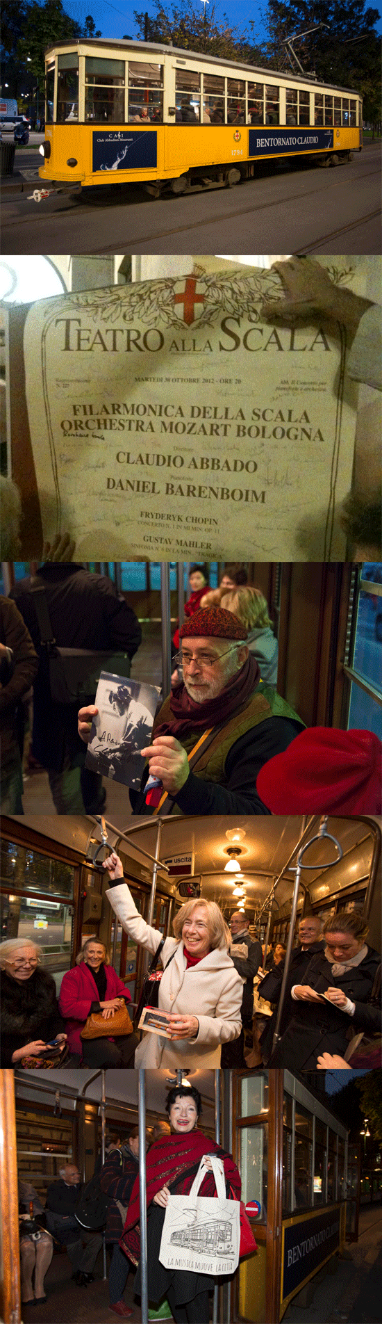 I bagarini? In fila, ma per entrare: una questione di priorità. Si capisce. E poi il tram con la scritta “Bentornato Claudio” circolante per la Città due ore prima del concerto; in sottofondo la musica di Mahler nelle interpretazioni del Maestro: un’idea di Attilia, Presidentessa del CAI, Club Abbadiani Itineranti (itineranti per via della lunga assenza del Nostro). Tra i Loggionisti dotati di bandierine con l’immagine di Abbado, qualche incredulo turista, convinto forse che si trattasse di una sognante normalità tutta locale o del set di un film di Fellini.