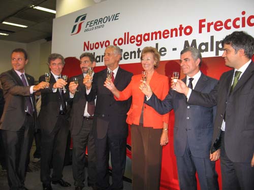 Come vanno le previsioni su Malpensa ormai è chiaro per tutti. Cosa ne è stato dell’Eurostar che partiva alle 06.30 a.m. dalla stazione di Gallarate, andava a Roma e tornava a Gallarate alle 23 con 0 (zero) passeggeri? E l’arrivo del Frecciarossa direttamente a Malpensa, inaugurato con grande enfasi con lo slogan “l’unico aeroporto italiano con l’alta velocità”? Sparito. Soldi nostri deliberatamente buttati dalle FFSS, come sapevano bene anche quelli che, all’inaugurazione del Frecciarossa, brindavano al nulla il 13 settembre 2010. Nella storica foto dell’evento appaiono, con i calici in mano, Roberto Formigoni Presidente Regione, Letizia Brichetto (Moratti) sindaco di Milano, Raffaele Cattaneo Assessore regionale, Marco Reguzzoni deputato, Mauro Moretti AD di FFSS e Beppe Bonomi Presidente di SEA. Le cariche indicate sono quelle dell’epoca.