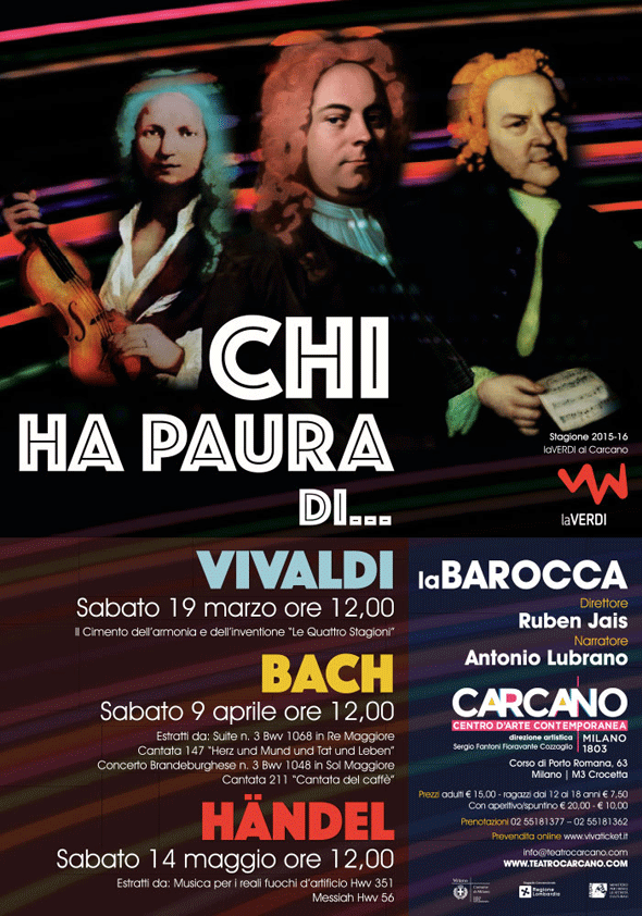 musica12FBEbbene, sabato 19 marzo, ore 12.00, al Teatro Carcano una piccola folla si è data appuntamento “per saperne un po’ di più”. La locandina annuncia: “Chi ha paura di Vivaldi?” Al centro del palcoscenico i musicisti dell’Ensemble La Barocca con il Maestro e Direttore Ruben Jais. Sul lato sinistro, un leggio e un narratore. Diavolo di un narratore. Con il suo eloquio dal registro colloquiale e dalla garbata cadenza partenopea coinvolge il pubblico del quale riesce a interpretare le curiosità. Inizia col porre delle domande al direttore: “Ma la musica sa parlare? Come riesce la musica a rappresentare tipi umani, a descrivere fenomeni naturali?
