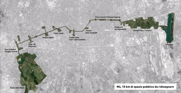M4, la metropolitana dei parchi e dell’acqua M4 è un’occasione eccezionale per costruire un ambiente di qualità e un nuovo paesaggio urbano con la realizzazione di un grande sistema lineare di aree fruibili che:
