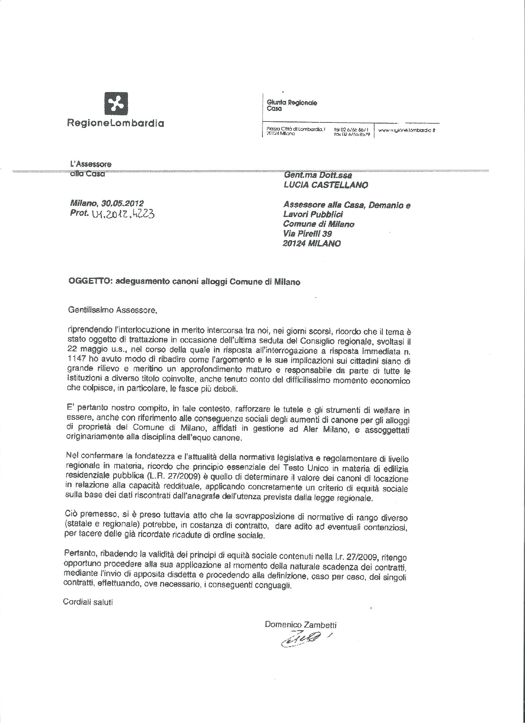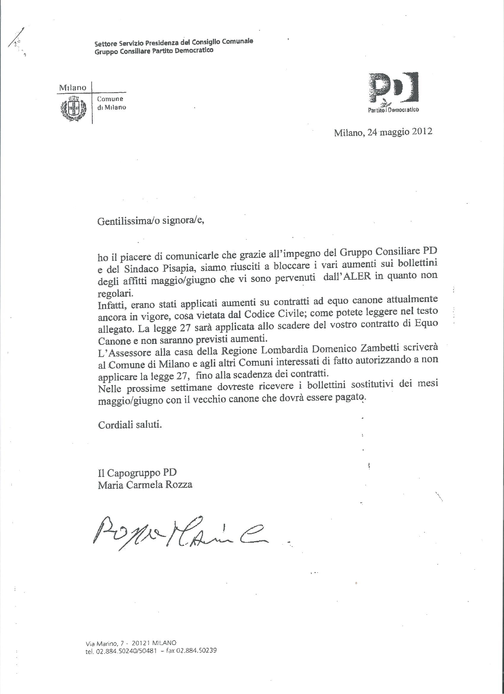 Di questa stessa attività “calmieratrice” si vantò la capogruppo del Pd Carmela Rozza nel maggio 2012 quando l’assessore regionale Zambetti sollecitò Lucia Castellano, assessore alla casa del Comune di Milano, a disapplicare una norma che imponeva il ricalcolo dei canoni ancora in vigore a seguito delle norme sull’equo canone, ricalcolo sfavorevole per gli inquilini in questo caso non riconducibili alla categoria dei meno abbienti. L’applicazione della legge fu sospesa e Carmela Rozza ebbe modo di comunicarla personalmente per conto del Pd agli inquilini.