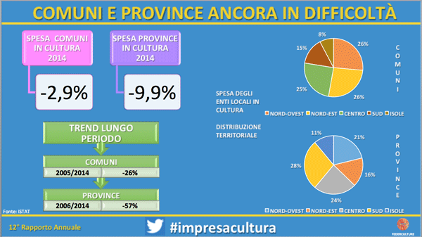 Accanto alle buone notizie, c’è l’evidenza di un’area di sensibile peggioramento: la contrazione degli investimenti dei Comuni, che nonostante gli sforzi delle Amministrazioni Locali, sono in grave difficoltà nel sostenere le iniziative culturali locali, e hanno visto ultimi dieci anni ridursi di un quarto gli investimenti,