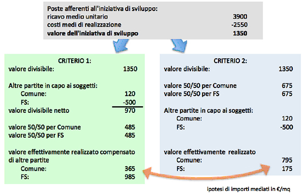 Un primo principio si basa sull’ipotesi di assegnare tale quota al netto di tutte le partite economiche correlate a ciascun soggetto. Tali partite si sintetizzano in: 120€ corrispondenti al versamento fisso di 50 milioni previsto nell’Accordo di Programma e il valore di una quota di ERP data in ipotesi per l’Amministrazione Comunale; 500€/mq per bonifiche e costi di sviluppo fino a fine processo valorizzativo per FS-SU.