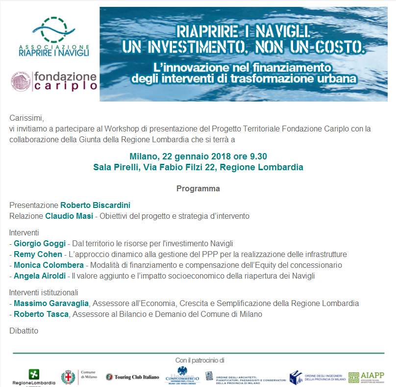 Tanto per restare ai Navigli e non mollare l’osso, ricordo l’assessore al bilancio Tasca presente al convegno del 22 gennaio scorso in Regione, dal titolo Riaprire i navigli, non un costo ma un investimento. In quel convegno la tesi era che la riapertura dei Navigli non sarebbe costata un soldo al Comune: tutto sarebbe andato in un miracoloso circuito di project financing e generosi sponsor. Non ricordo alcuna obiezione da parte dell’assessore. Ma allora questi soldi ci sono o non ci sono?