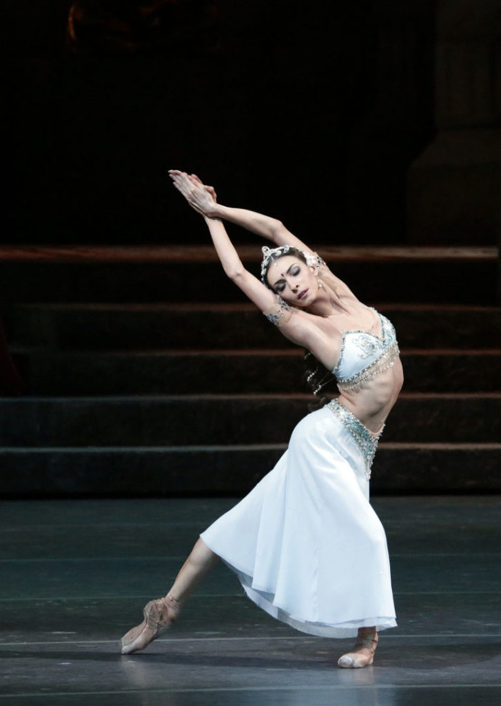 Ol’ga Smirnova è la Nikiya perfetta, le linee lunghissime delle sue braccia sembrano toccare l’infinito con le dita. Mostra una rotazione infinita di tutte le parti della gamba, dando l’impressione e la convinzione di un grande senso del controllo, di equilibrio e di sospensione. Il dolore interiore di Nikiya traspare grazie al suo calibrato e musicale stretching del corpo, ma allo stesso tempo la gioia del personaggio nel cortile antistante il tempio con Solor traspare dalla velocità di basso gamba, dalle punte solide e dal sorriso delicato.